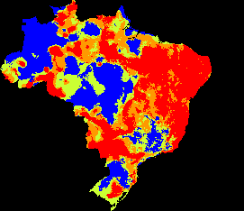 Modelo de consenso construído com base em cinco algoritmos diferentes. O resultado exibe apenas áreas onde há concordância entre a maioria dos algoritmos: em vermelho todos os algoritmos concordam, em laranja quatro e em amarelo três. Há potencial de uso em tomada de decisão. Atenção: o modelo não é da distribuição real e sim da distribuição potencial, ou seja, indica áreas supostamente adequadas ambientalmente para a espécie de acordo com os parâmetros da modelagem.
