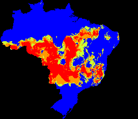 Modelo de consenso construído com base em cinco algoritmos diferentes. O resultado exibe apenas áreas onde há concordância entre a maioria dos algoritmos: em vermelho todos os algoritmos concordam, em laranja quatro e em amarelo três. Há potencial de uso em tomada de decisão. Atenção: o modelo não é da distribuição real e sim da distribuição potencial, ou seja, indica áreas supostamente adequadas ambientalmente para a espécie de acordo com os parâmetros da modelagem.