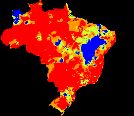 Modelo de consenso construído com base em cinco algoritmos diferentes. O resultado exibe apenas áreas onde há concordância entre a maioria dos algoritmos: em vermelho todos os algoritmos concordam, em laranja quatro e em amarelo três. Há potencial de uso em tomada de decisão. Atenção: o modelo não é da distribuição real e sim da distribuição potencial, ou seja, indica áreas supostamente adequadas ambientalmente para a espécie de acordo com os parâmetros da modelagem.